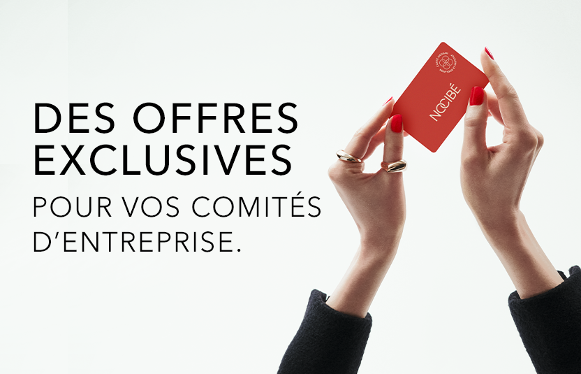 * Offre non cumulable et non substituable avec toutes autres offres promotionnelles, soldes ou remises en cours dans les parfumeries Nocibé participantes. Remise valable sur nocibe.fr. Non valable sur les produits « Petits Prix », « Points Rouges », « Prix Ronds », « Belles Affaires », « Prix Barrés », « Coffrets institut », Cartes cadeau, Cartes Institut, forfaits institut, programmes beauté et emballages payants. Hors Dom Tom & Monaco. Voir conditions d’acceptation en magasin. Offre valable uniquement pour les clients Comité d’Entreprise. La remise permanente n’ouvre pas droit aux points fidélité.
